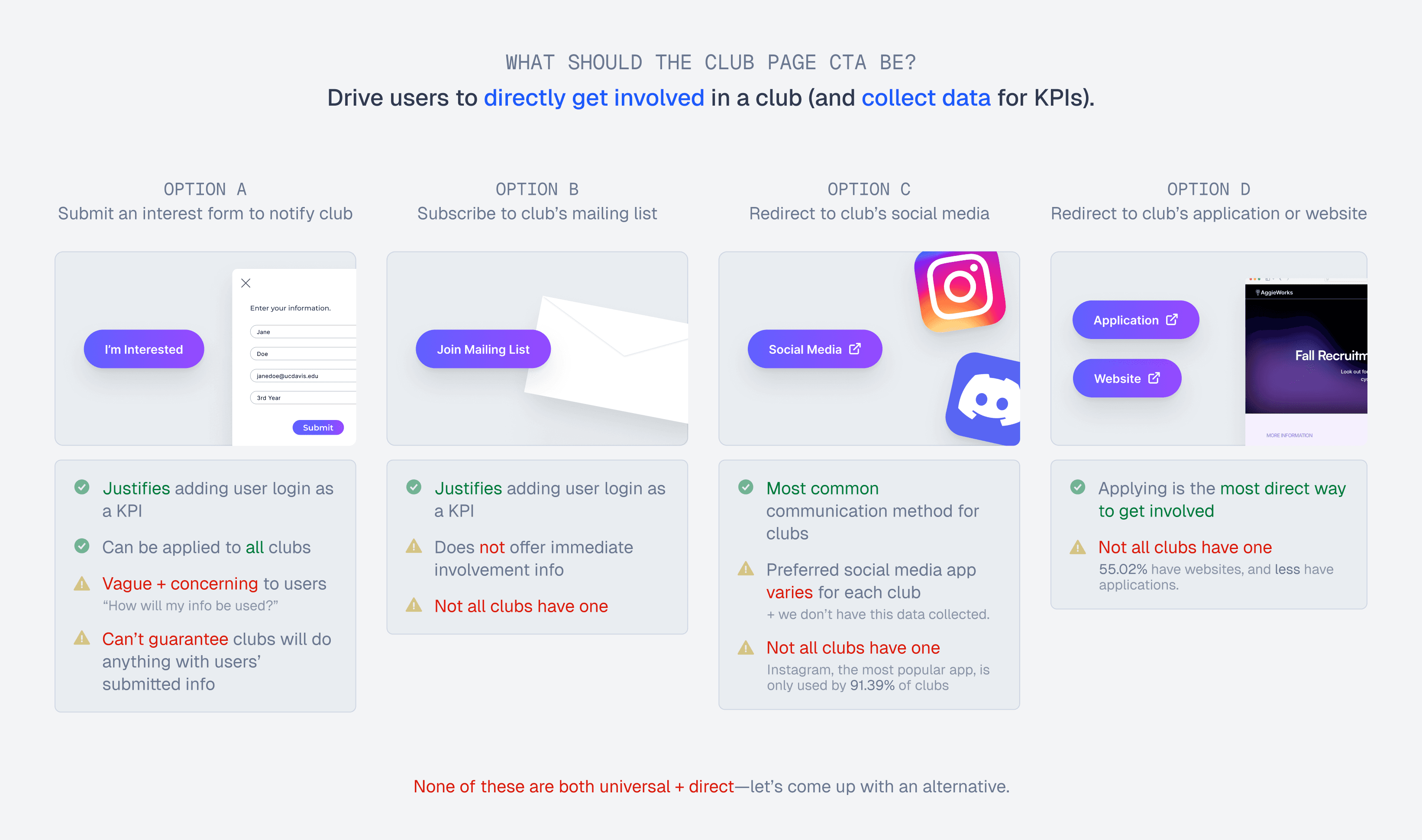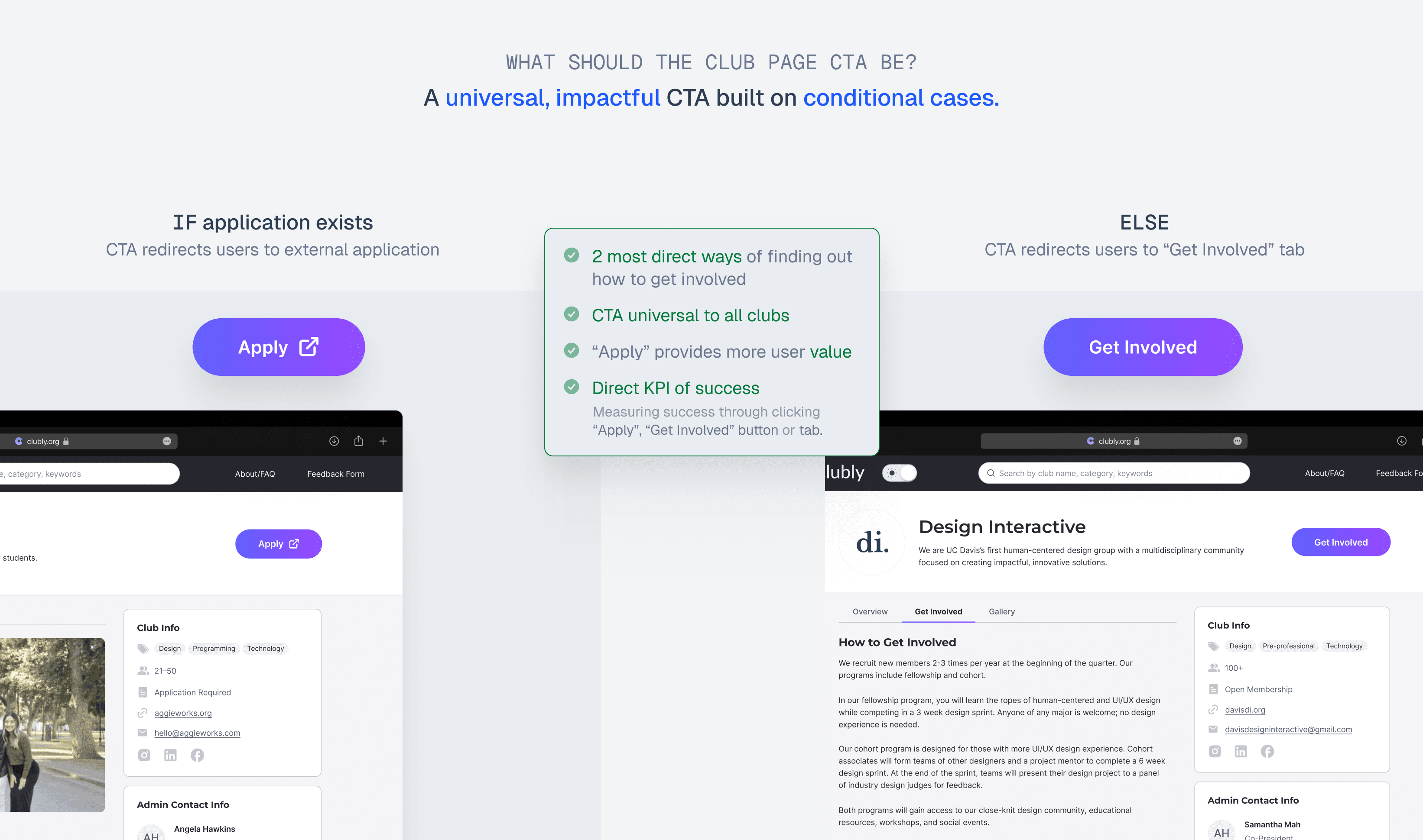 We lacked data on which type of CTA clubs prefer on their page—which is why we were aiming for a universal solution. But, I quickly found that settling on a universal solution was a huge issue—each club operates differently + unpredictably.