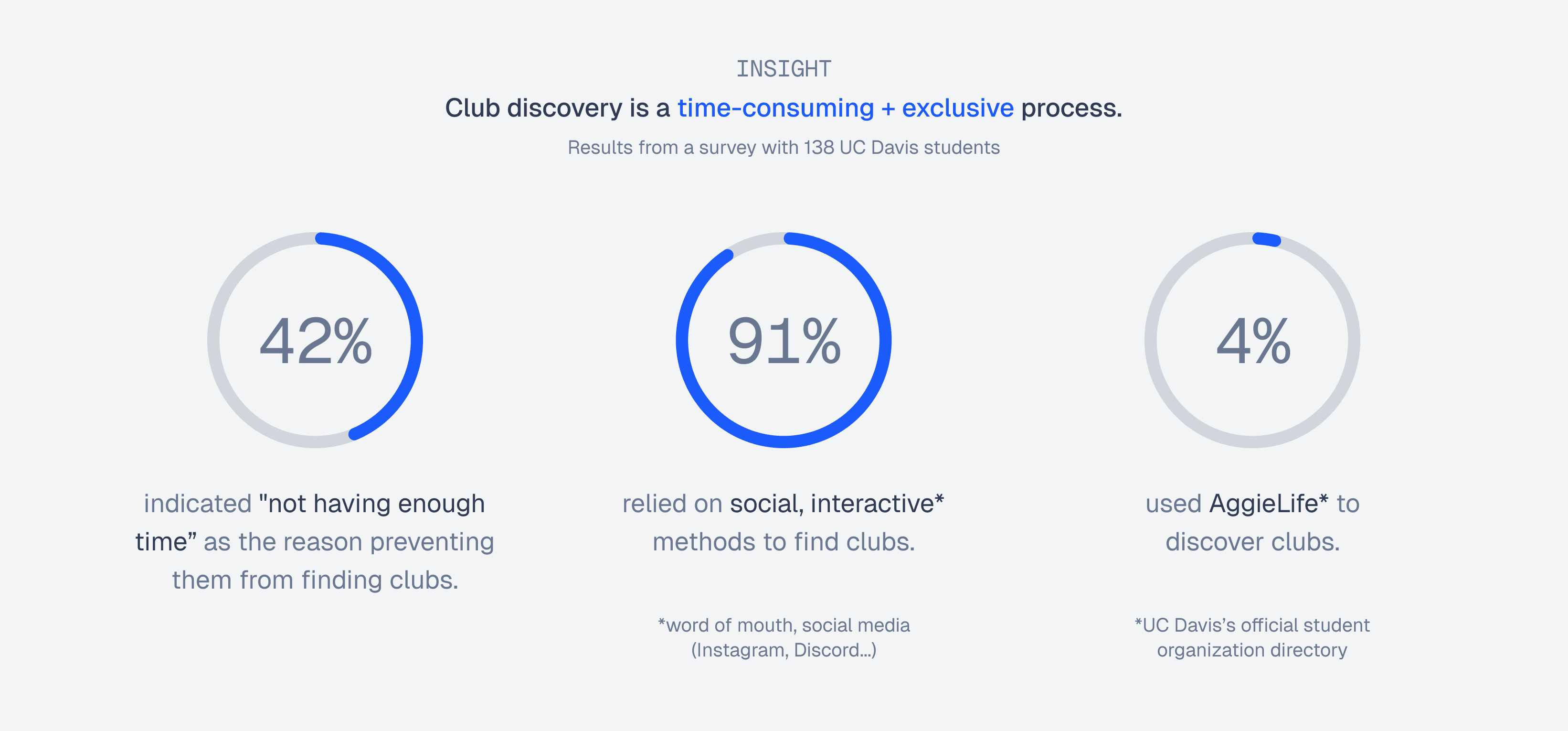 Due to the fast-paced nature of this project, I was unable to conduct new user research. To accommodate to this constraint, I dug through Clubly's UXR archive to gather insights on user behavior during club discovery.