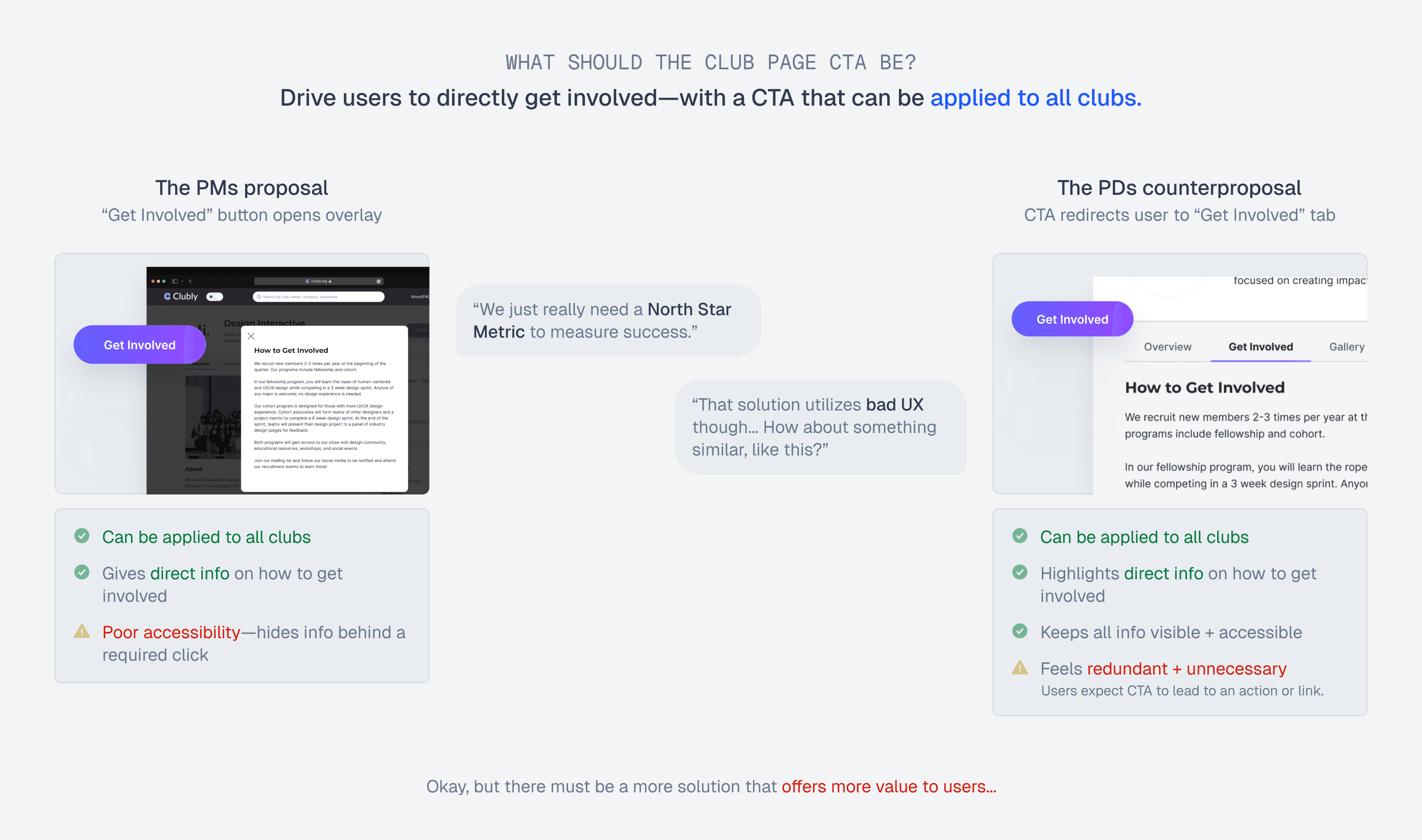 This was the biggest debate of the redesign—the main CTA of each club page. I closely collaborated with the PMs to come up with a CTA and NSM to measure success: whether users were finding the "perfect" clubs.