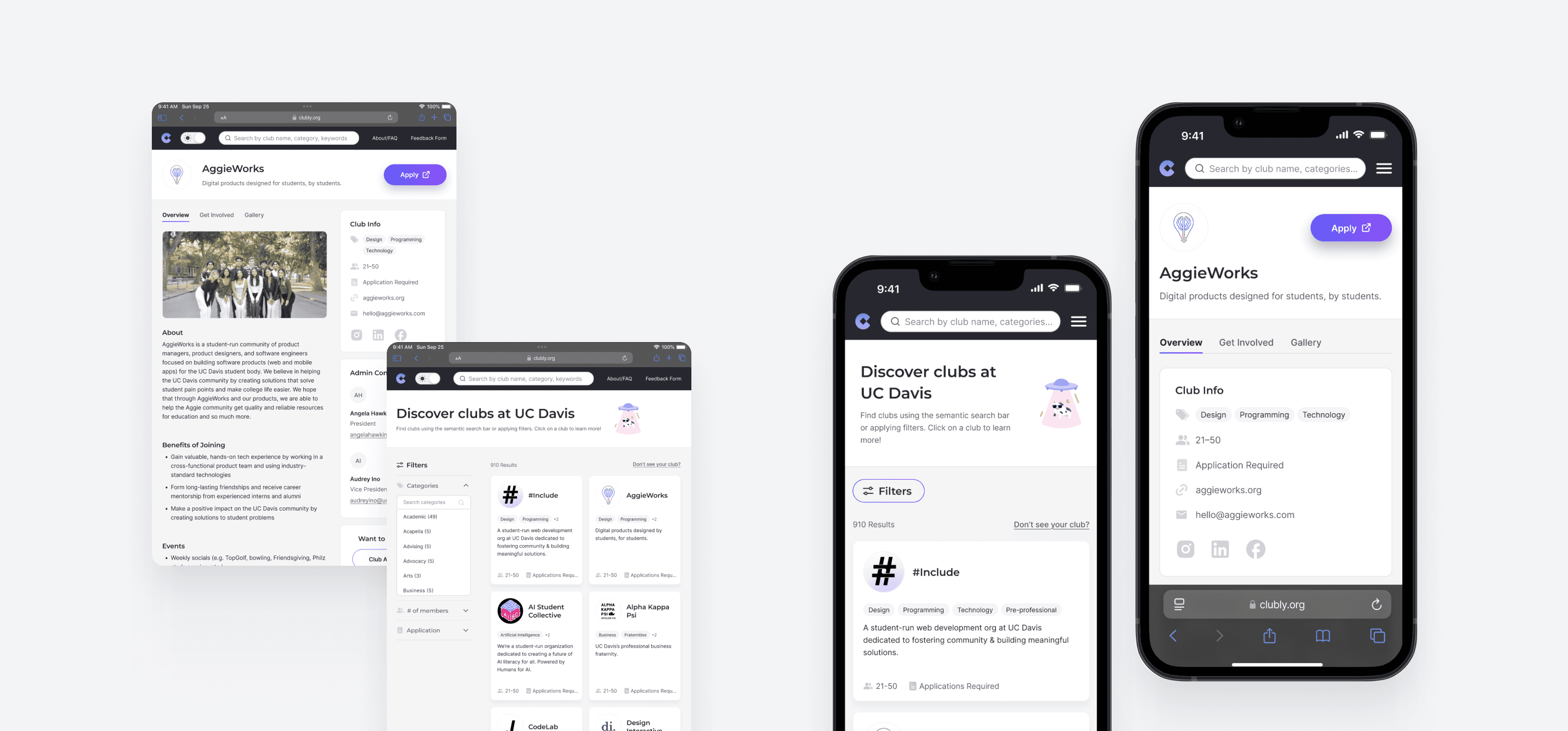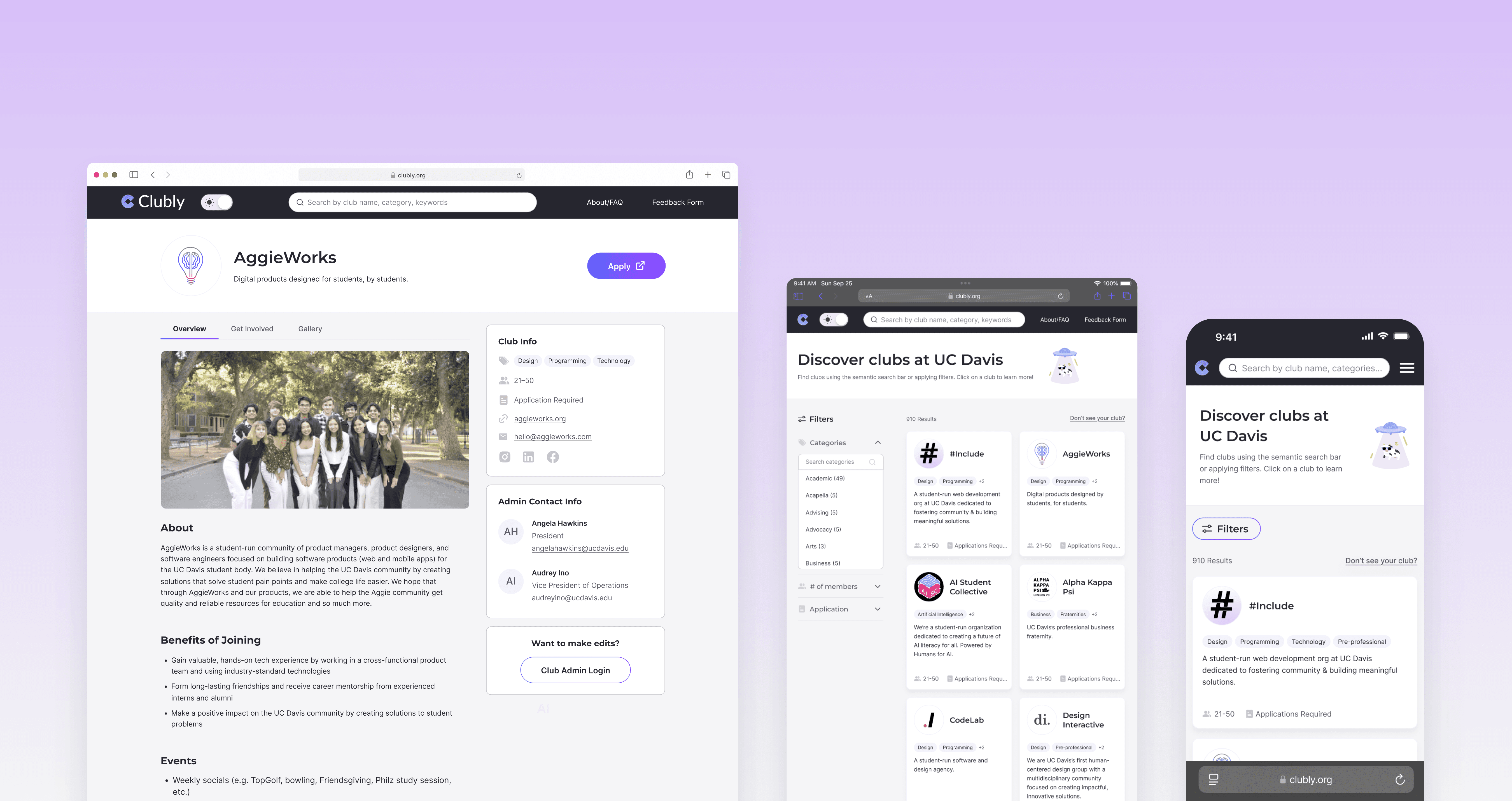 Clubly is a club discovery platform, where students can access all UC Davis clubs and their info in one hub.