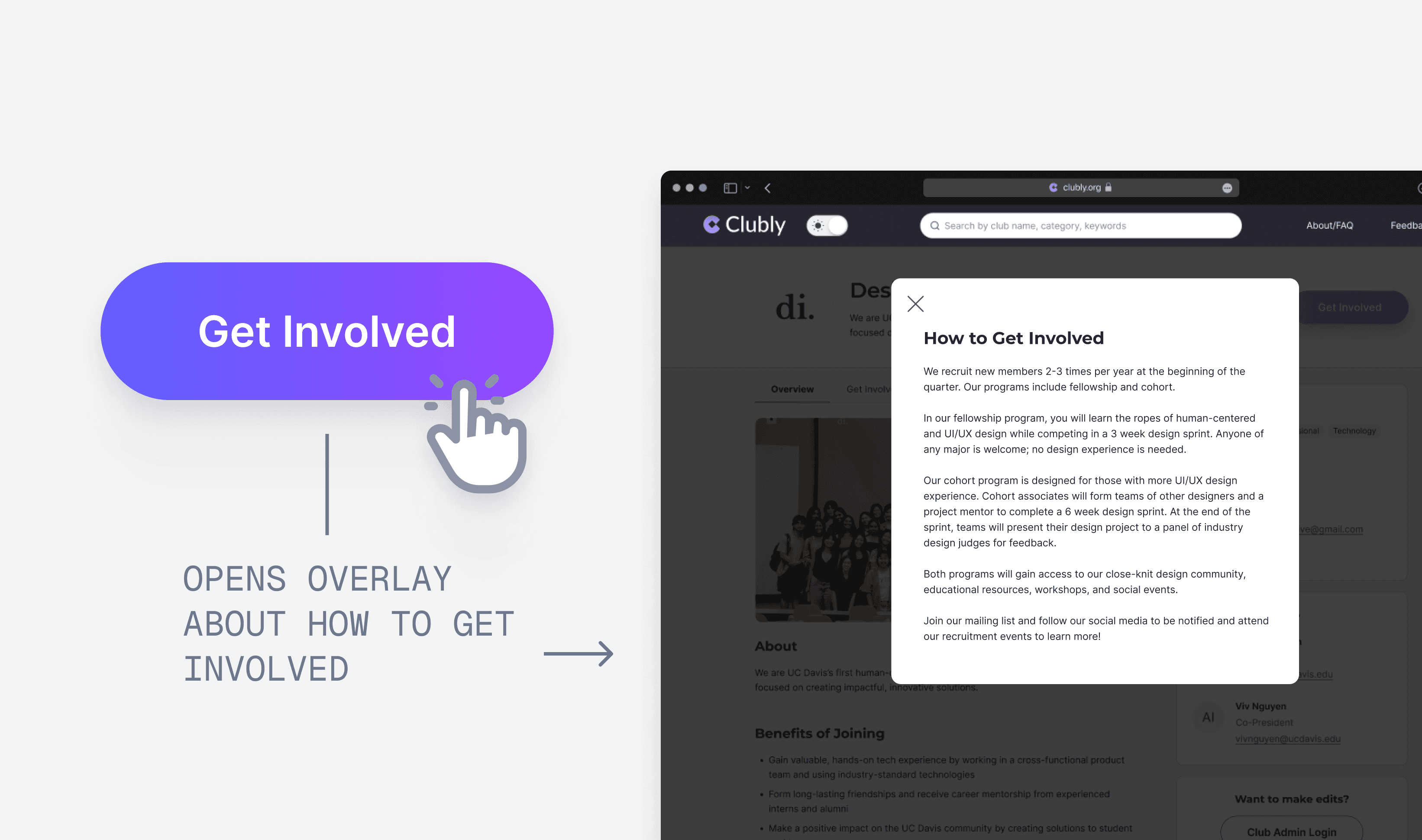 Clicking on this button would open an overlay with information on how to get involved with the club.
