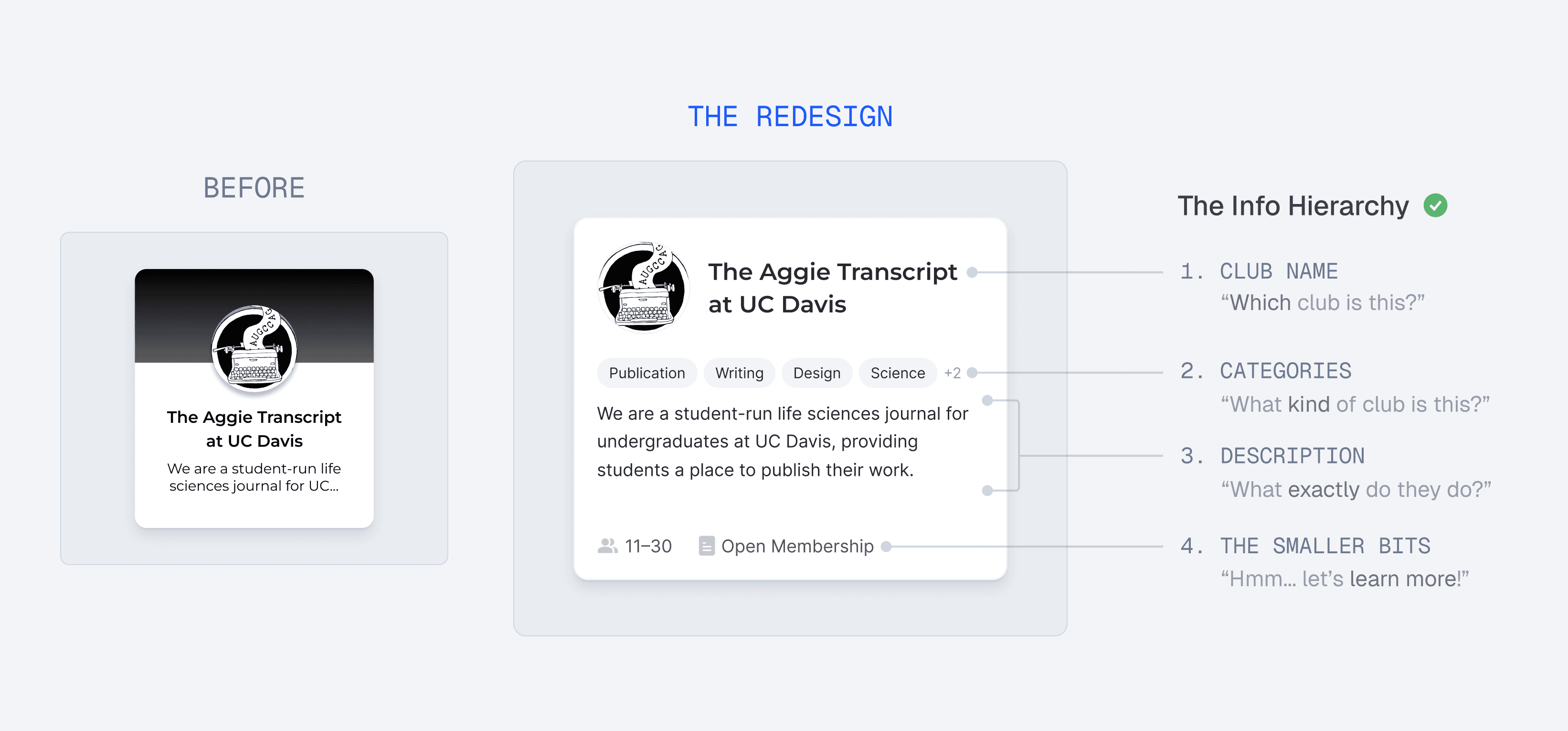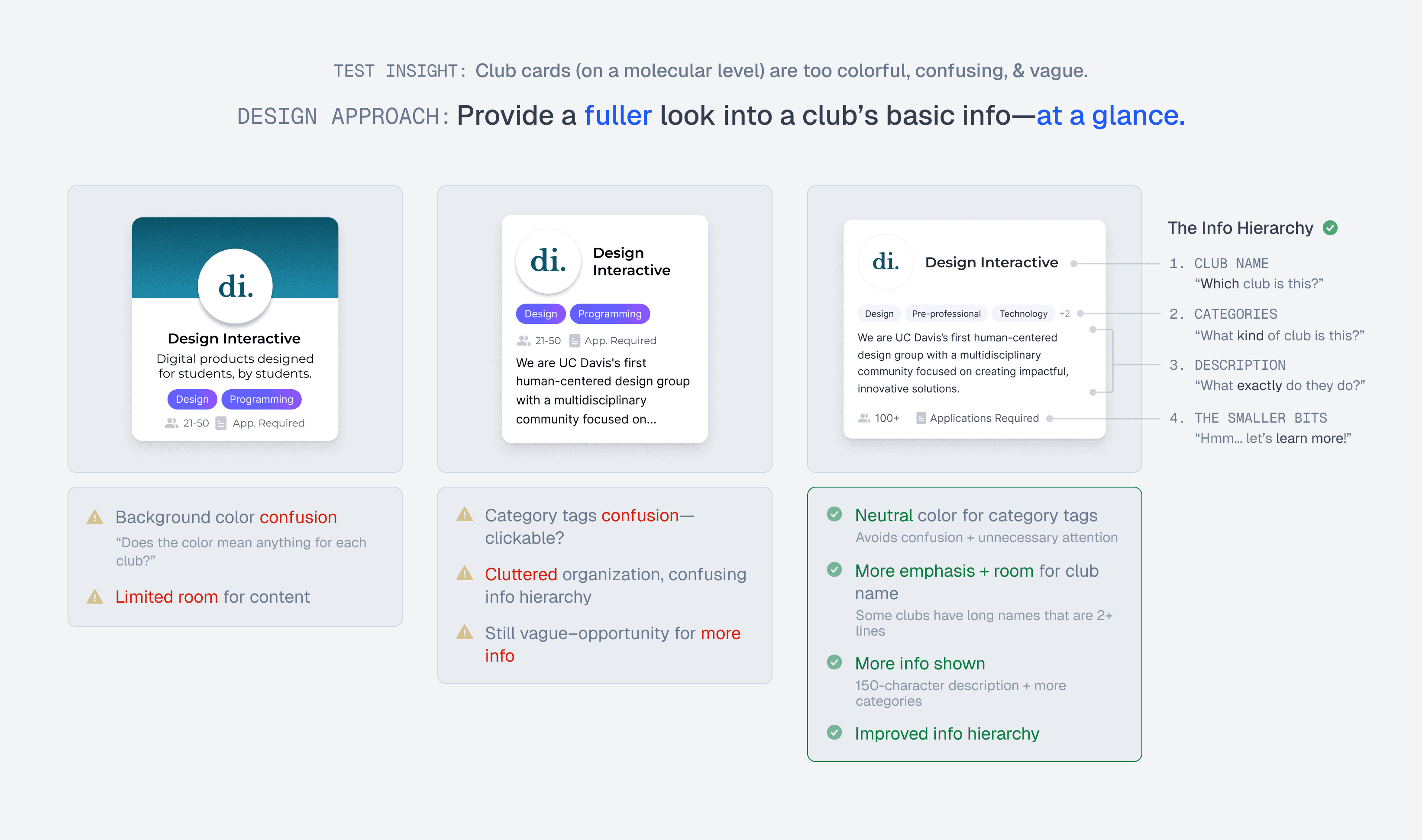 I began refining one of the core components: the club cards. Digestible and informative club cards enable users to grasp each club's essence at a glance. Now that they are more readily informed, users should only click on clubs that genuinely interest them, avoiding time wasted on irrelevant options.