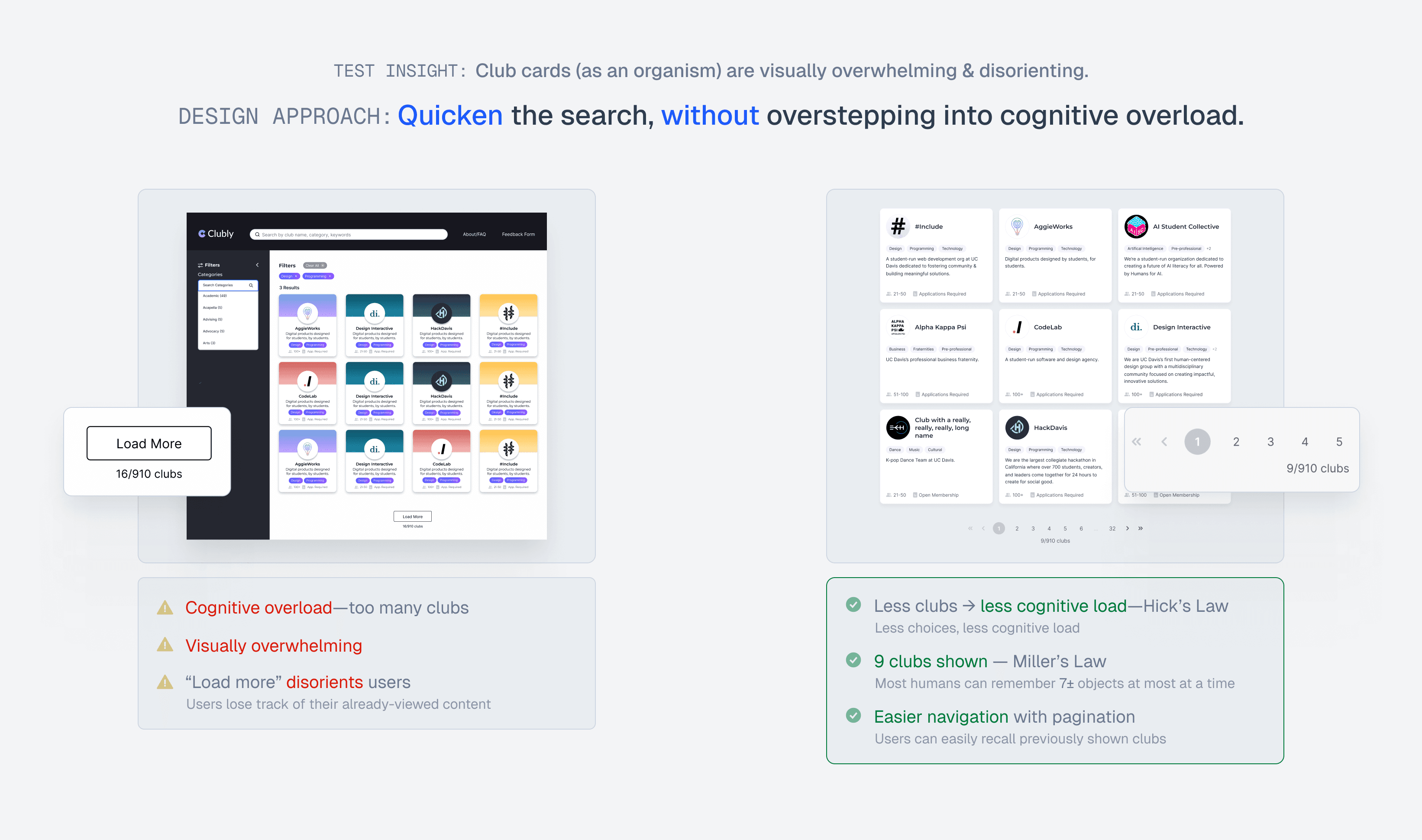 Why not less than 9? There are 800+ clubs—we still wanted our users to view more clubs at a time + spend less time clicking through pages (without the cognitive overload, of course).
