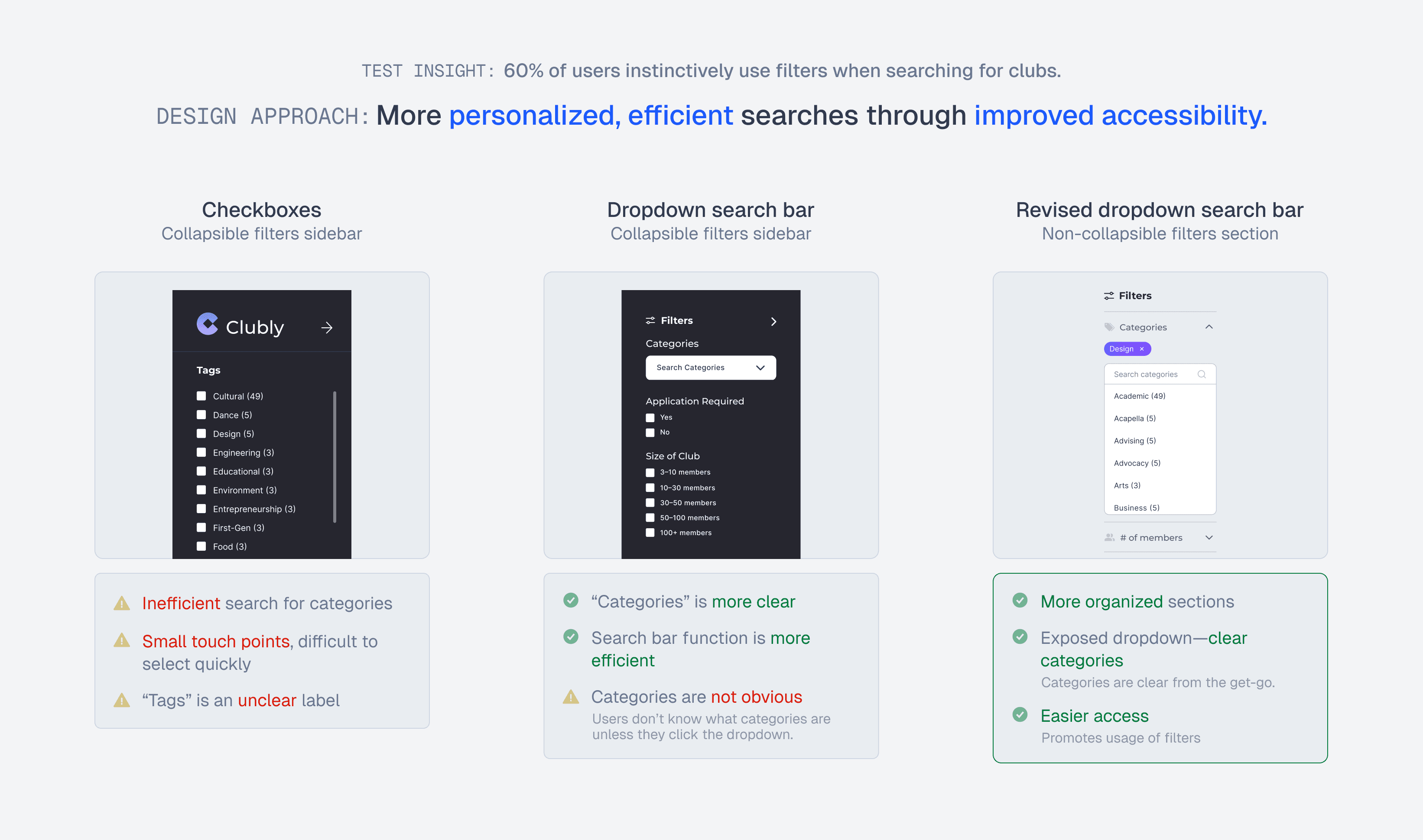 User testing revealed that a significant portion of users utilize filters in their searches. Thus, we decided to promote filters + made the filters "AND" operators, allowing for club results that are more specific to the user's preferences.
